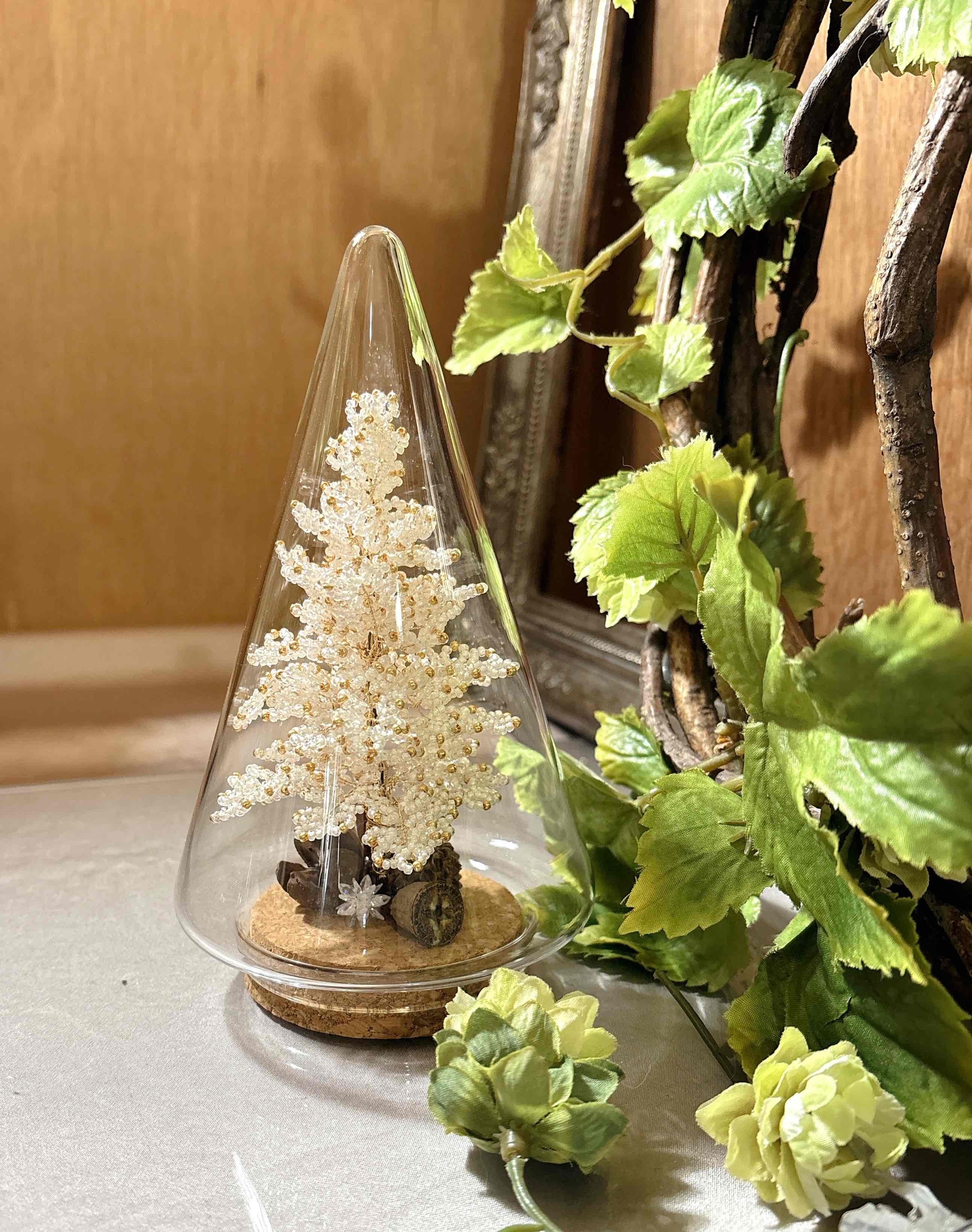 ビーズフラワー*クリスマスツリー ガラスドーム/ホワイト×ゴールド